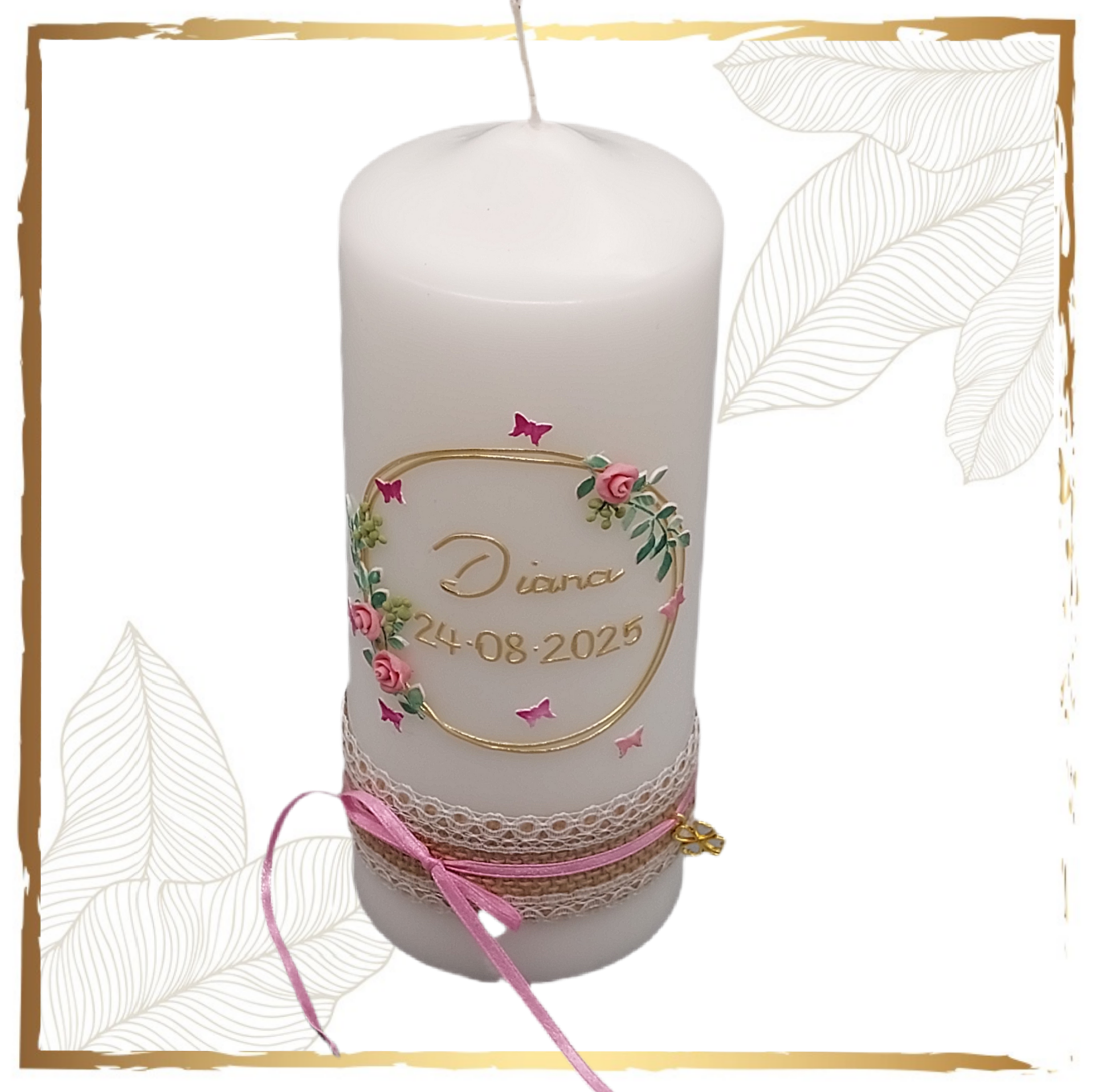 Firmungskerze mit Rosen und Schmetterlingen.