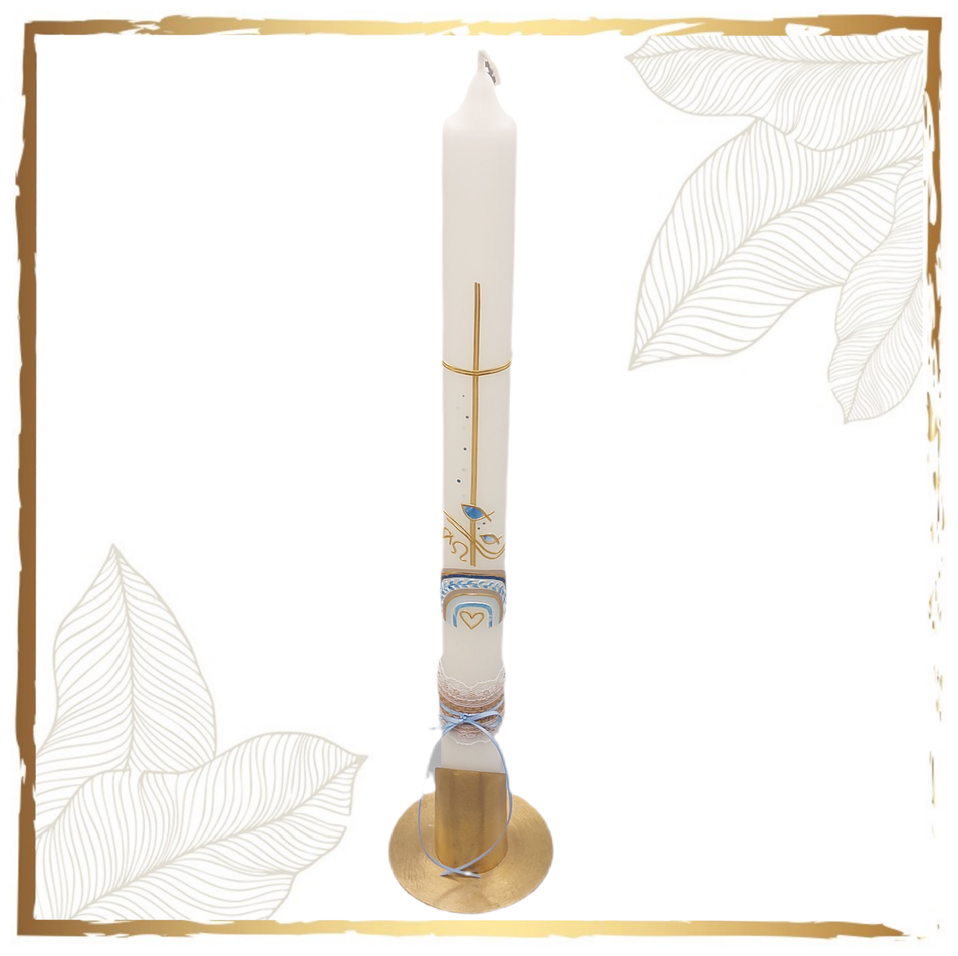 Taufkerze mit Juteband mit Spitze, Kreuz und einem Regenbogen.