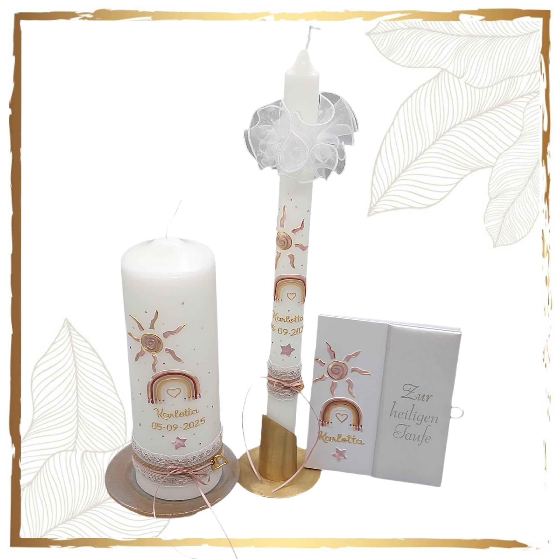 Dieses Taufkerzenset besteht aus einer langen Taufkerze (400x 30 mm) und einer Tischkerze (250 x 80 mm) mit demselben Motiv, ebenso einem Taufbrief mit gleichem Wachsmotiv, einen Teller für die Lebenskerze und einen Tropffänger für die lange Taufkerze (ohne Kerzenständer für lange Taufkerze) und je Kerze ein kleiner Charm-Anhänger.