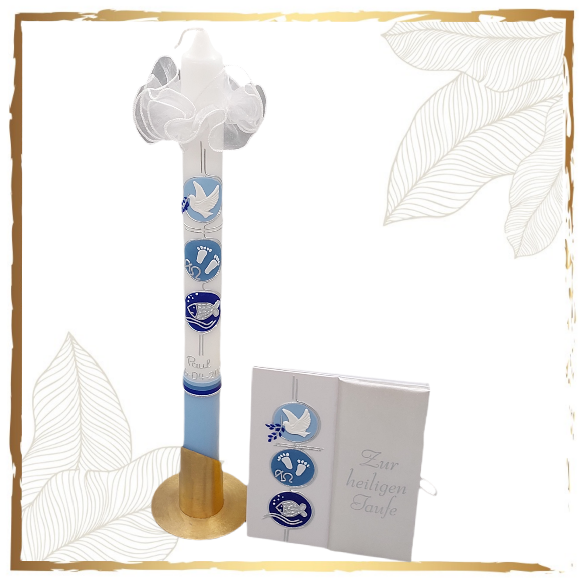 Dieses Taufset besteht aus einer langen Taufkerze (400x 30 mm) und einem Taufbrief mit gleichem Wachsmotiv und einenm Tropffänger für die lange Taufkerze (ohne Kerzenständer für lange Taufkerze)